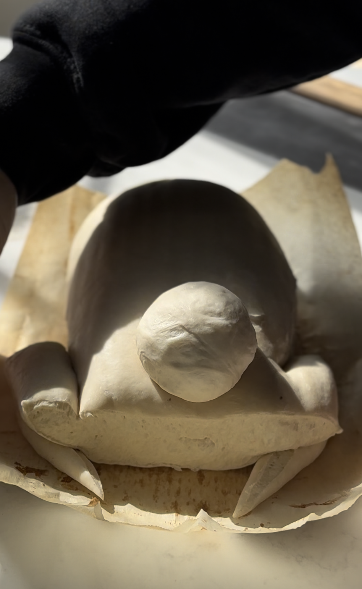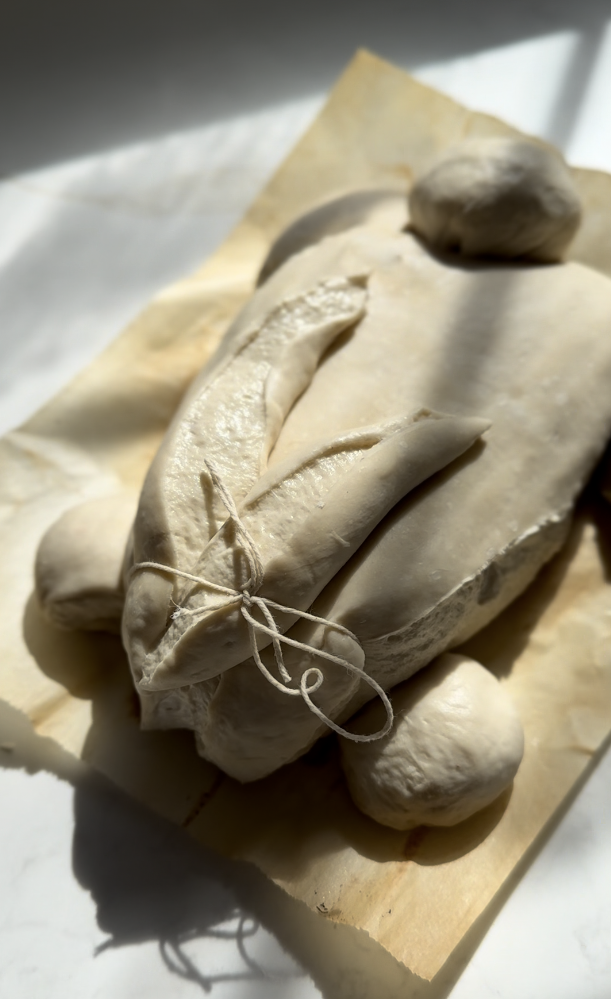 Photos below show making one large sourdough Easter bunny, but you can follow the same steps for smaller ones. Note: for mini bunnies, I find it easier to skip the back legs and just cut a small portion off to shape into a round tail, but you can do either way!