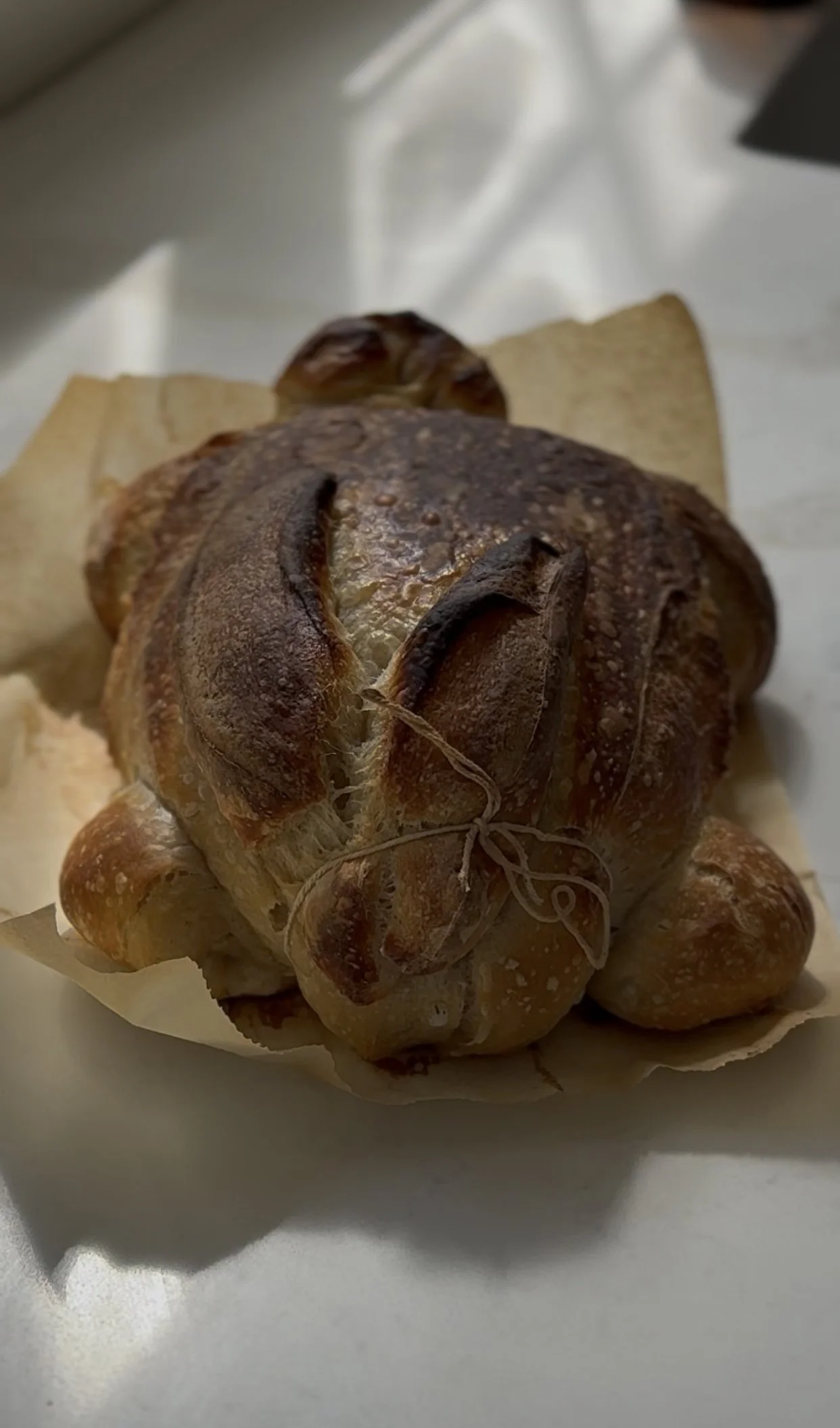After the first half of the bake, remove the dutch oven lid and bake for another 18-20 minutes (large loaf) or 15-ish (mini loaves). When it’s a dark golden brown color, remove from the oven and let your bunny loaf cool for an hour or two. Cut the twine and gently pull off.